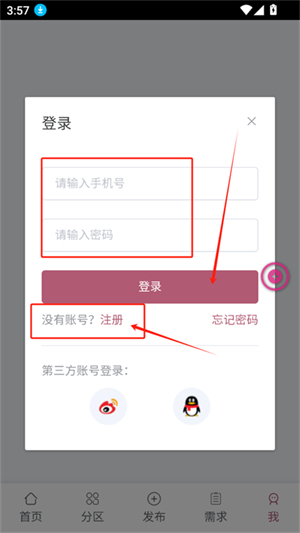 2、输入手机号和密码可以快速登录,没有账号点击注册
