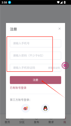 3、然后输入手机号、验证码和密码,点击注册即可