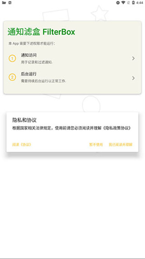 注意:通知滤盒app所有功能都需要持续在后台运行才能发挥效果。如果您使用的小米、华为等国产系统请自行在多任务、系统设置等界面允许此 app 的后台运行、开机自启、电池白名单等权限。