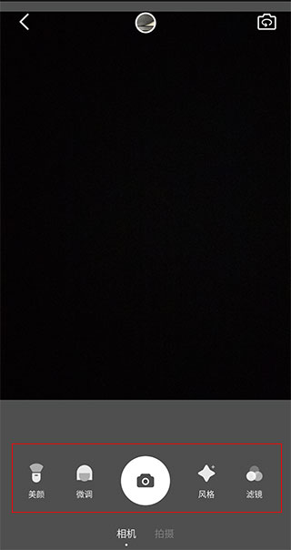 2、选择相机后即可进入美颜相机界面,上方为相机选景框,选景框下方则是各个美颜滤镜功能,大家可根据需要使用。
