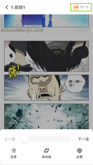 阅读漫画时无广告干扰,底部功能栏支持切换上/下一话、打开目录和多源切换,还能选择上下滚动、普通、日漫三种阅读模式,调整背景颜色并开启允许缩放,适配不同阅读习惯。
