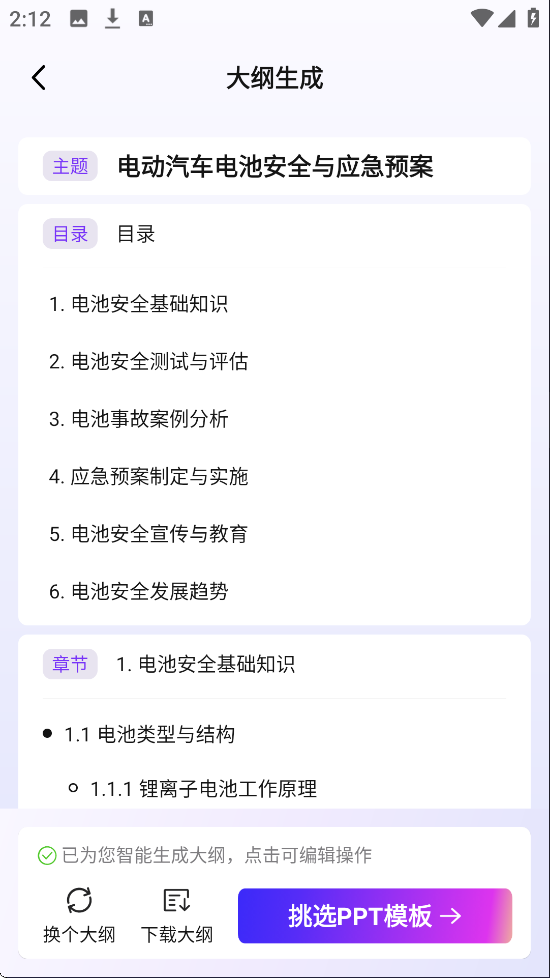 3、生成大纲后,用户可以选择下载大纲,也可以继续挑选PPT模版进行排版美化