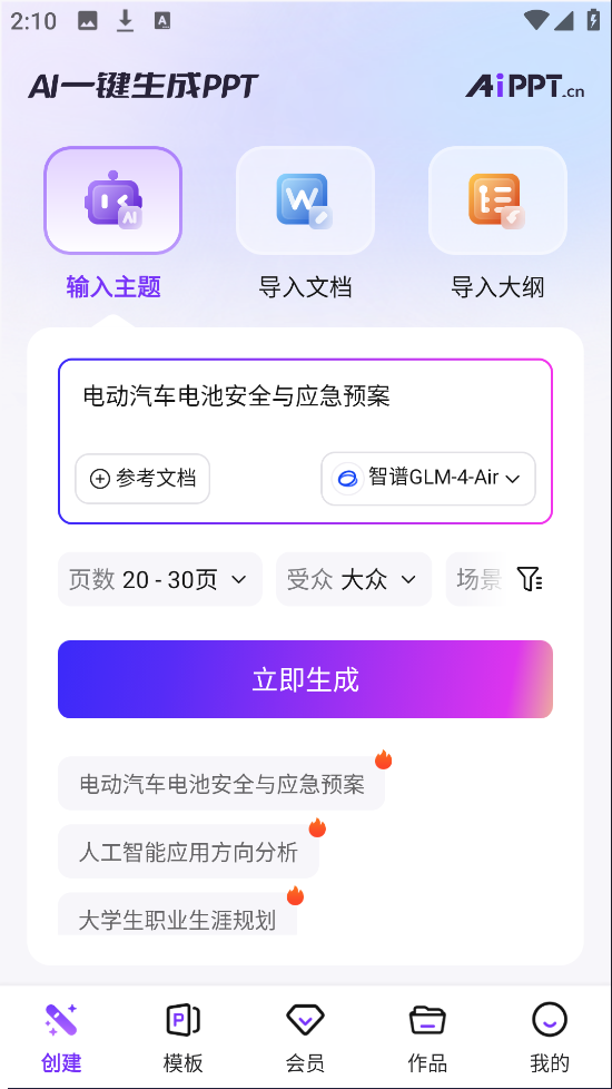 1、打开软件,输入PPT主题,输入完成之后点击立即生成