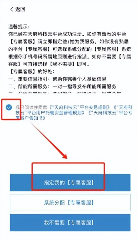 四、注册完成后,指定专属客服:“专属客服”,“勾选已阅读”,“指定我的专属客服”,搜索“李静”,选择“四川省林学会李静”,点击“确定”。