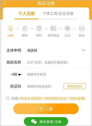 2、选择个人或商户,再选择主体申明,输入商店名称、手机号、验证码后,点击下一步按照提示操作即可开店。