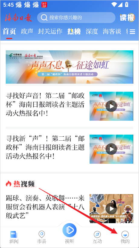 1、打开海南日报APP,点击右下角的【我的】,进入个人中心页面。