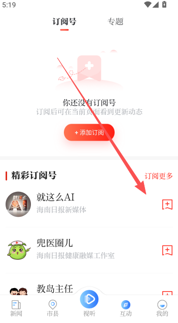 2、在互动页面中,找到并点击【添加订阅】按钮,进入订阅列表。