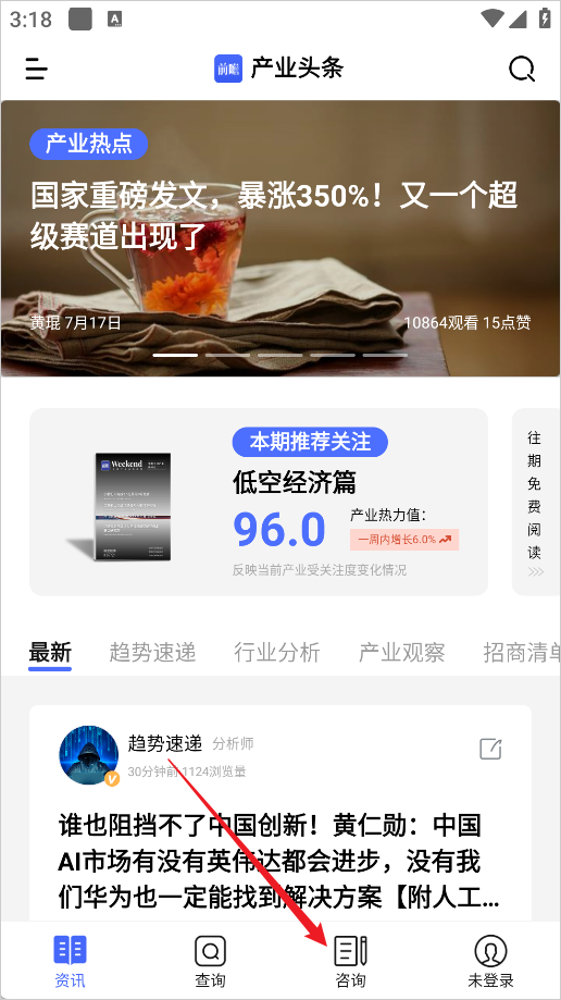 1、进入前瞻经济学人App点击进入咨询页面;