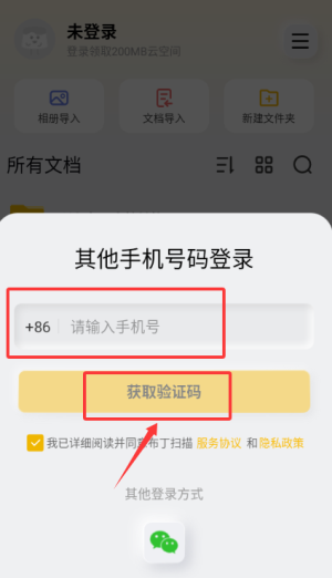 1、于登录页输入手机号获取验证码并填写,完成账号登录。