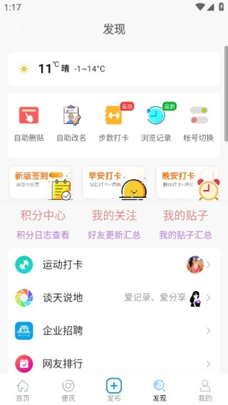 4、支持自助删帖,自助改名片,统计每天运动步数,使用时支持账号切换。