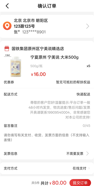 3、在确认订单界面选择正确的地址后点击提交订单。