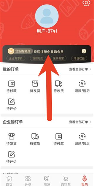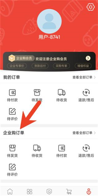 1、在用手机号注册登录央企消费扶贫App后进入“我的”界面,点击头像下方企业购会员进入。