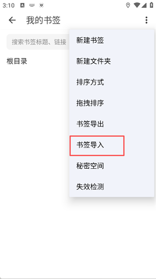 2、进入“我的书签”页面后,点击右上角三个点,在下拉菜单中选择书签导入。