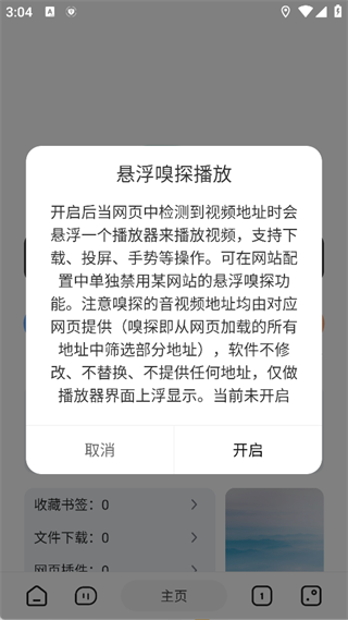 3、在弹窗中点击开启,即可启用视频嗅探功能。