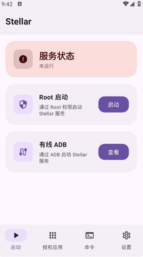 打开Stellar应用,根据界面引导选择启动模式(ADB或Root),启动成功后服务日志会显示运行状态。
