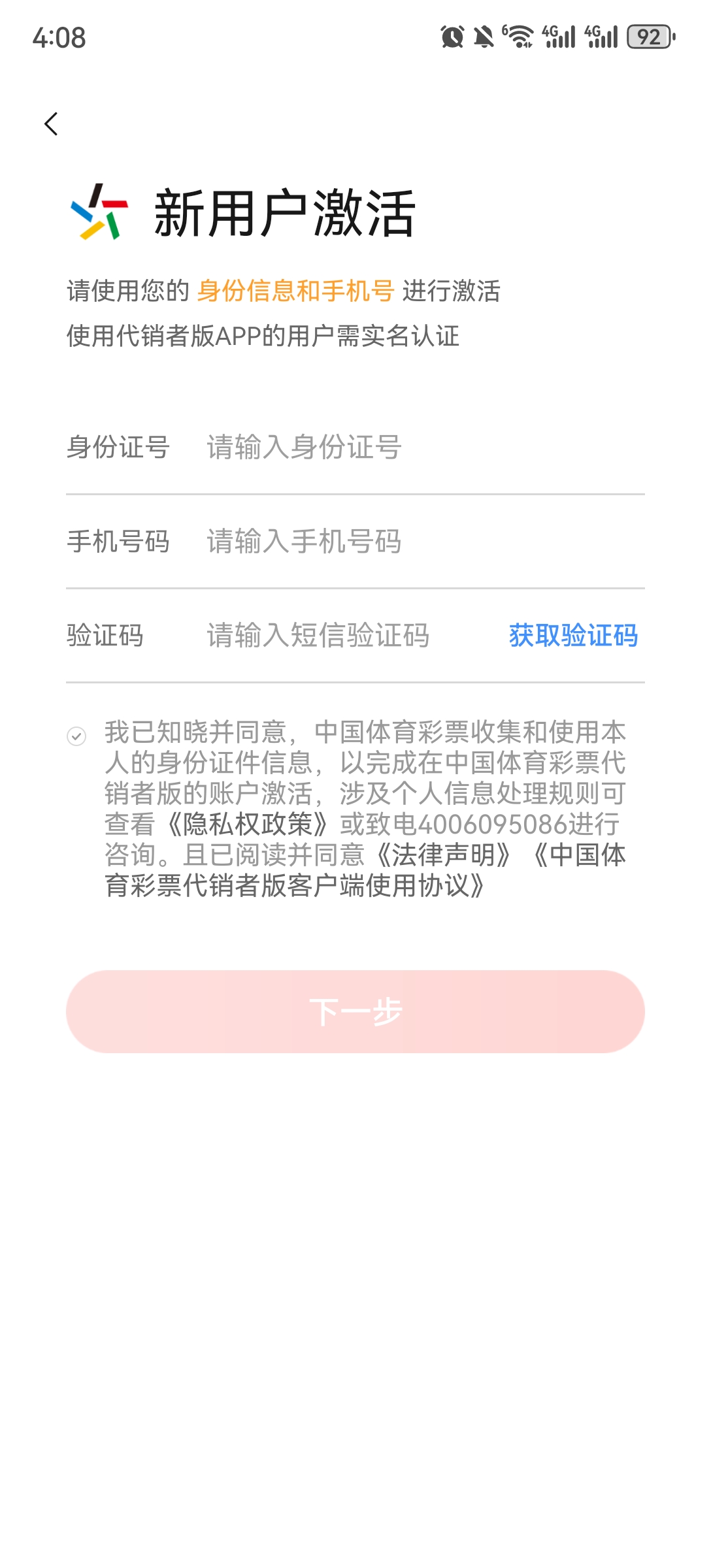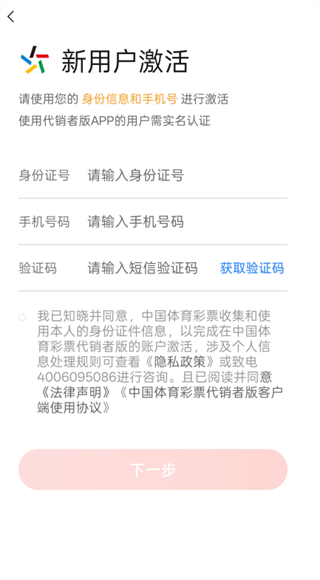 1、如果你是中国体育彩票官方授权的代销者,并且官方登记身份证和手机号信息为本人使用,进入App后选择下方用户激活,进入账号激活界面。