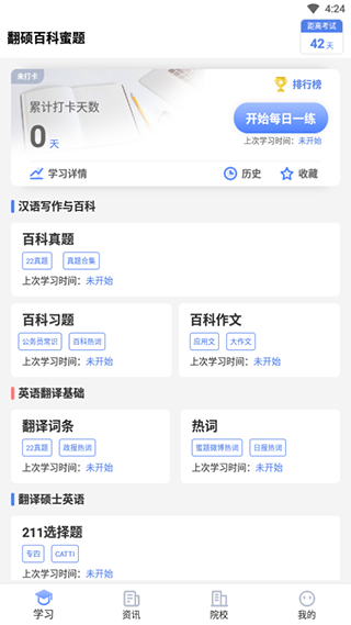1、学习界面可以使用每日一练,百科真题,百科习题,百科作文,翻译词条,热词等功能