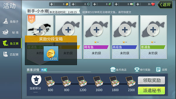 指定稀有度的任务提交鱼时,会获得单倍该鱼的积分。提交水域随机鱼种时,会双倍获得该鱼的积分奖励,要拉开鱼王赛排名的差距,需要着重关注双倍高星鱼种的获取上。