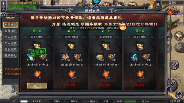 1、上线送井中月、噬龙伏魔钟、战神铠甲、自动回收、施毒术等,超值福利领不停!