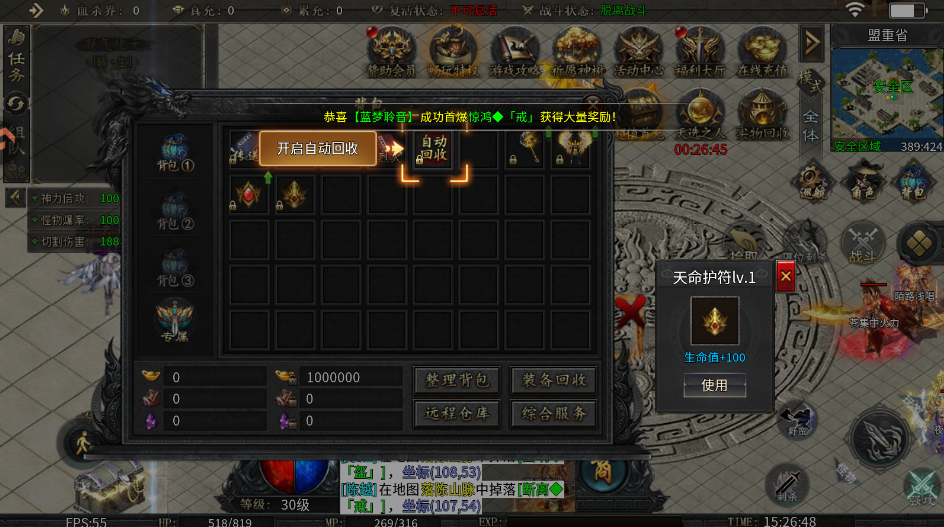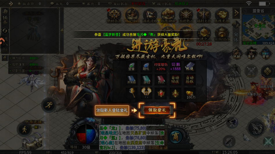 1、上线送自动回收、自动拾取、对怪增伤+20%,切割+1888等,超值福利领不停!