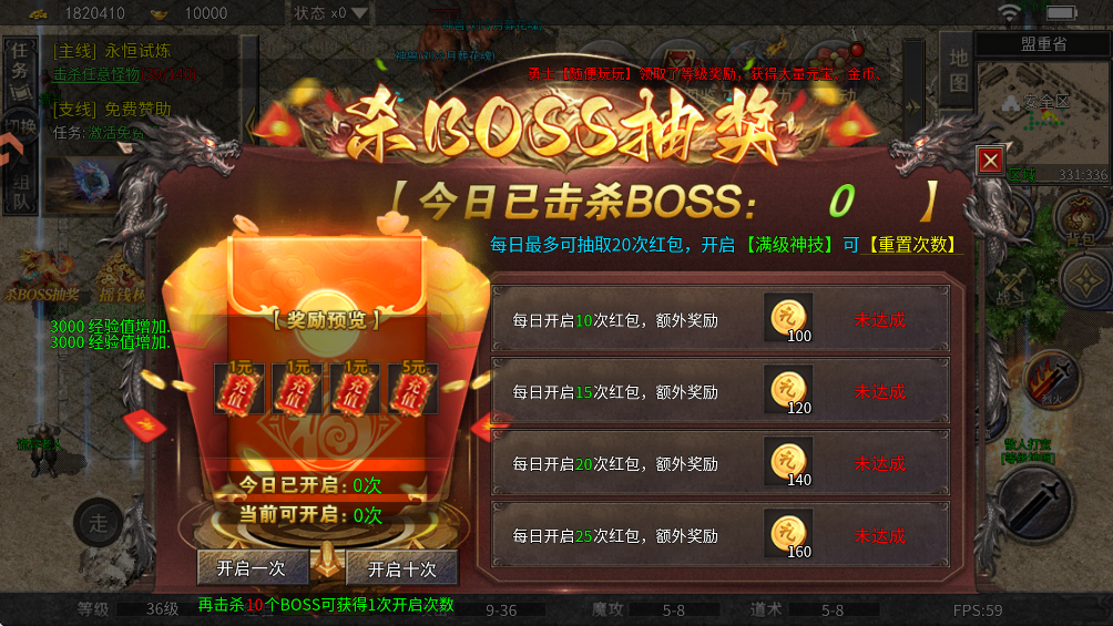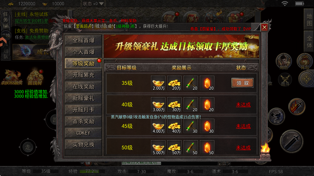 5、另外游戏内福利非常丰富,等级奖励、新服豪礼、首杀奖励、击杀BOSS抽奖等等