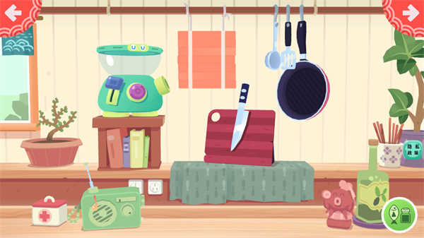 3、来到厨房后玩家可以自由选择道具进行烹饪,完成后点击右上角箭头。
