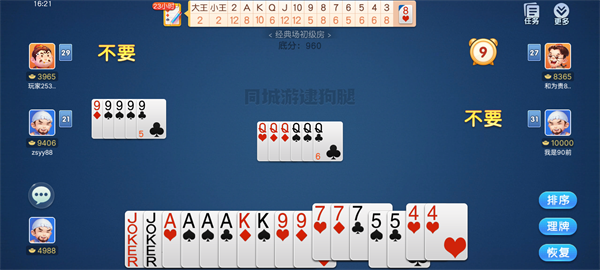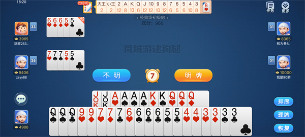 同城游逮狗腿免费版是一款深度还原六安本土经典玩法的手机棋牌应用,将传统“逮狗腿”这一极具策略性与对抗性的四人纸牌游戏完整移植至移动端。游戏支持实时同屏竞技,玩家可快速匹配同城好友或陌生牌友,在明暗双地主、身份隐藏、喜牌叠加、王炸压制等多重规则交织下,体验节奏紧凑、反转不断的烧脑对局。无需复杂操作,开局即上手,每一场都是智力、心理与运气的综合较量。