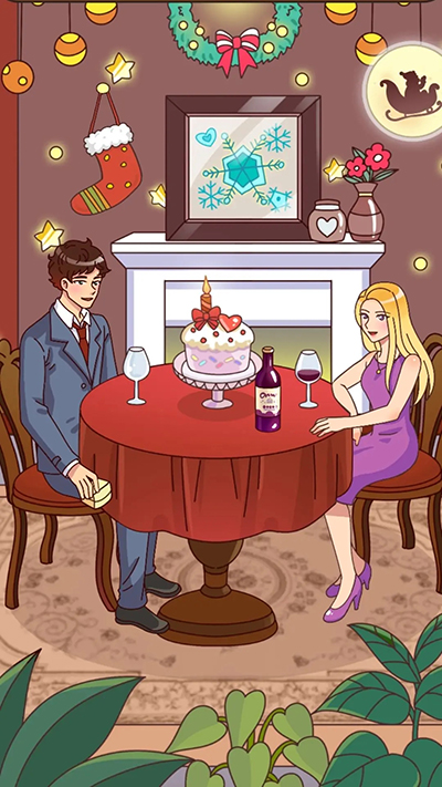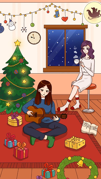 围巾给紫色头发的女孩,女孩手里有贺卡,点击贺卡(圣诞树)