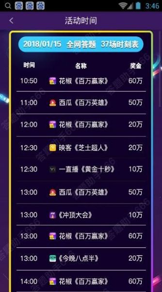 2、每天下午1点,晚上8点,准时开始,12道单项选择题,全部答对的所有人,平分本场的奖金,每场奖金从几万元到几千万元不等,以当天的预告为准。