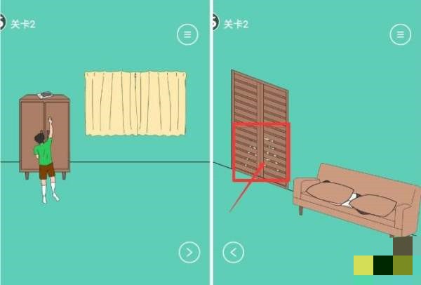 关卡2:手机在柜子上,但是够不到,需要一把凳子,凳子在衣橱门后面,将凳子拿过来踩到凳子上即可拿到手机。