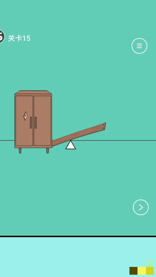 关卡15:在橱柜里收集到三角形的白色物品,在抽屉里拿到锤子,先用锤子把第一个房间柜子上的木板卸下来。然后把三角形物品放到柜子右边,用木板把柜子撬走。