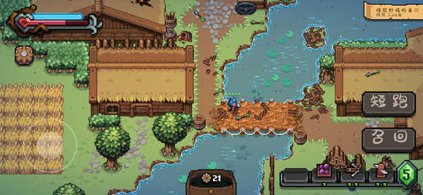 第一介绍,这是个像素塔防类游戏,左边上下左右移动,右边一个冲刺,一个召回。现目前出现的就是三个防建,一个是近战的旋风刀,一个远程的箭塔,最后一个减速的焦油地。