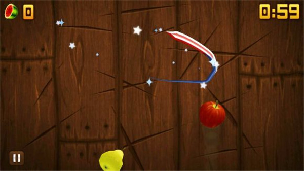 3、如果想要获得高分,最快速的方法就是连击水果,一刀下去切开更多的水果能获得更高的分数;