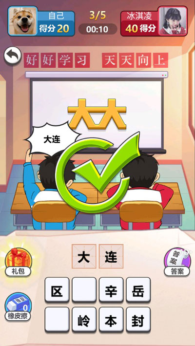 5、进入游戏对局,我们需要根据黑板上的图片,点击下方提供的汉字猜出正确的地名,
