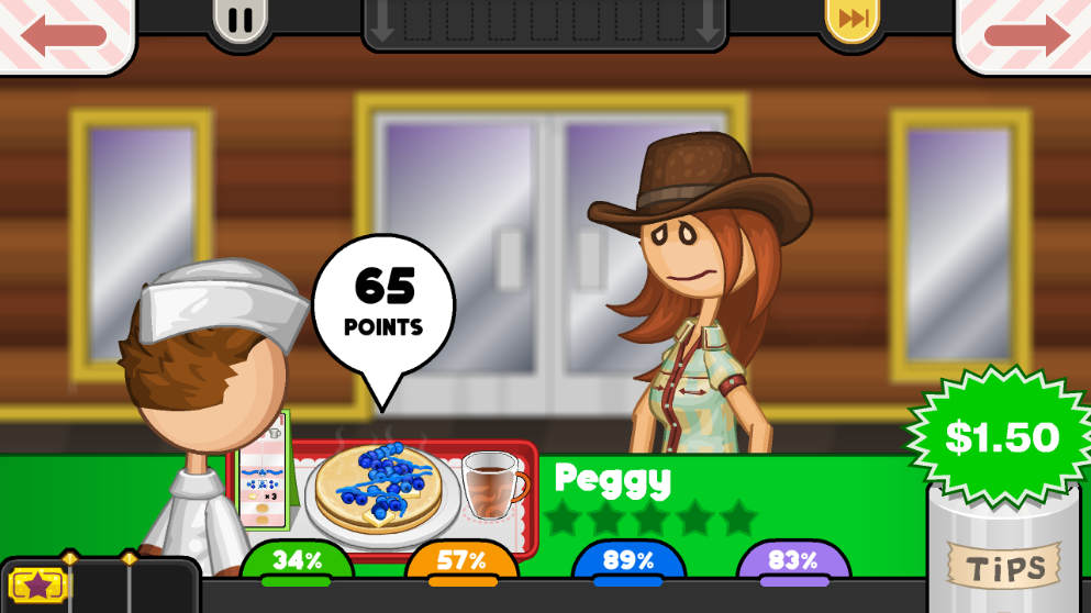 游戏有多个关卡,每个关卡设定了一定的目标,要求玩家在规定时间内完成任务,不断升级店铺并且赚取更多的金币,玩家可以在游戏中不断挑战自己,练习自己的操作技能。因为顾客会根据你制作出来的煎饼进行打分,分数越高,小费就越多。