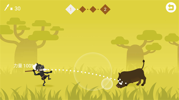 1、玩家需要控制手中武器的角度和力度,瞄准猎物,在猎物行动前松开手指即可完成射击。
