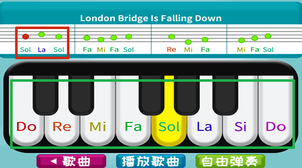 3、到具体弹奏页面后,按照上面红色方框内的音节,轻按下方绿色方框内的按键。