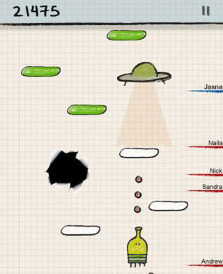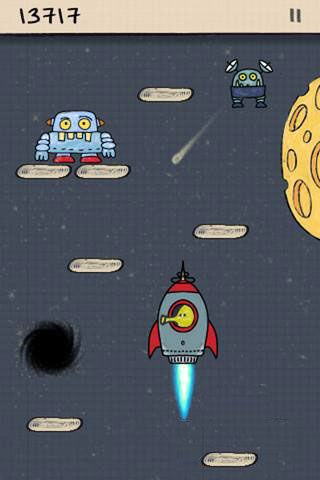 采用的是典型的手绘涂鸦风格,游戏名称也由此而来。游戏基本背景为浅色网格状背景,清晰明了。虽然色调较为简单,但画面显示依然非常的吸引人,在背景音乐上并没有下太多的功夫,整个游戏仅有两个音效。一个是跳跃过程中发出的响声,在这里玩家需要操作自己的小人,不断的进行条约和移动,但是难度会越来越难,小心沿途的障碍物和各种各样的突然出现的怪物,还能利用各种各样的工具道具帮助你通关,在跳跃中要小心破碎的平台、移动的蓝色平台、黑洞、不明飞行物和坏人,途中有快速上升的火箭和竹蜻蜓,这是一个富有趣味的技巧性游戏。这场魔性的体验之旅。