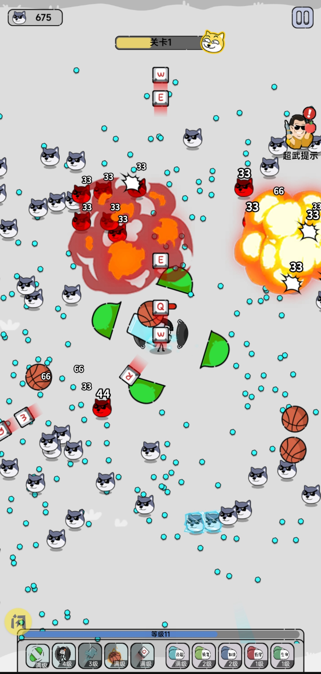2、升级使用各种技能,面对大量技能boss,肆意出击,过程非常欢快;
