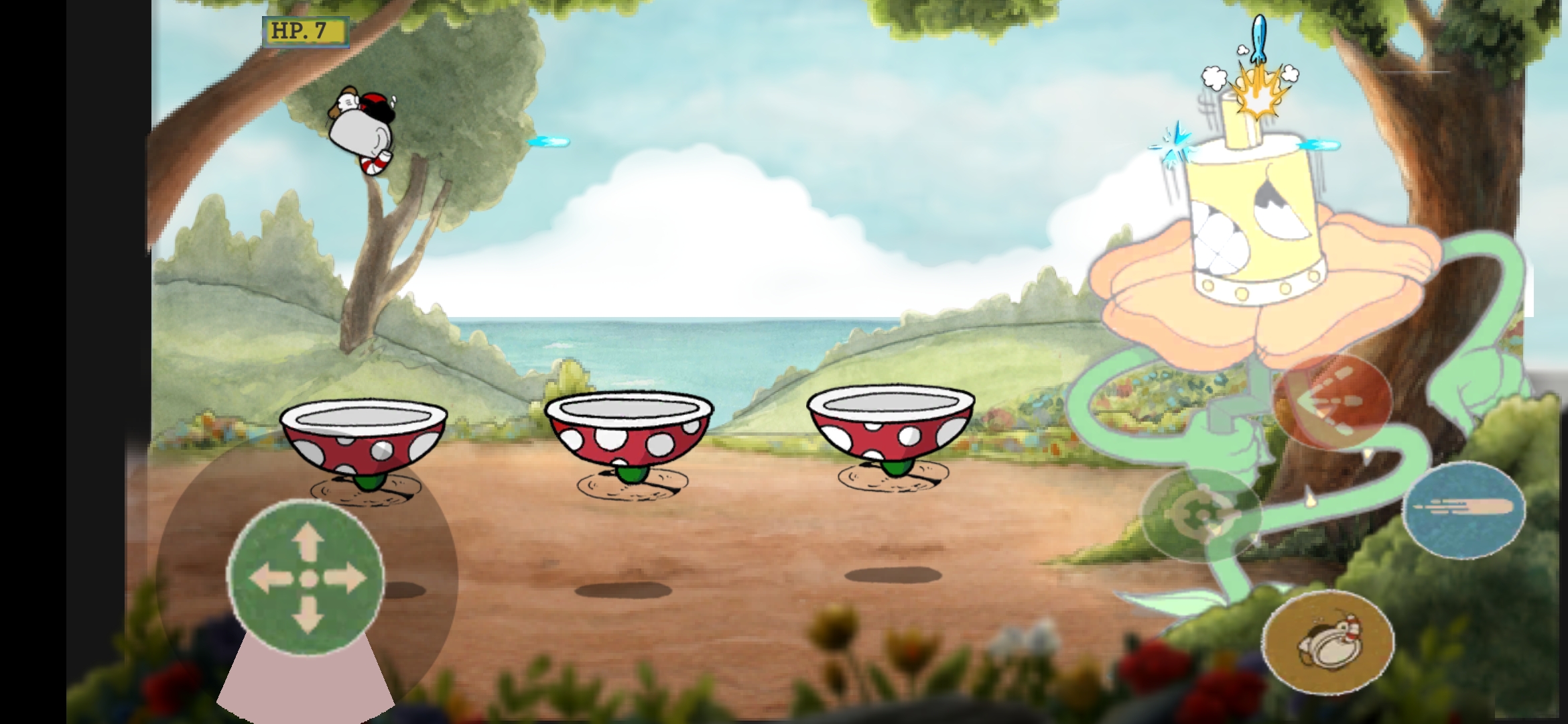 1.控制茶杯头角色在关卡中进行战斗,康乃馨BOSS有双重形态,需要攻击上百下才能成功击杀。