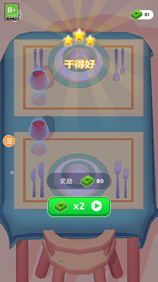 3、将餐具全部摆放正确后即可获得三星和钞票奖励,钞票可用于购买道具;