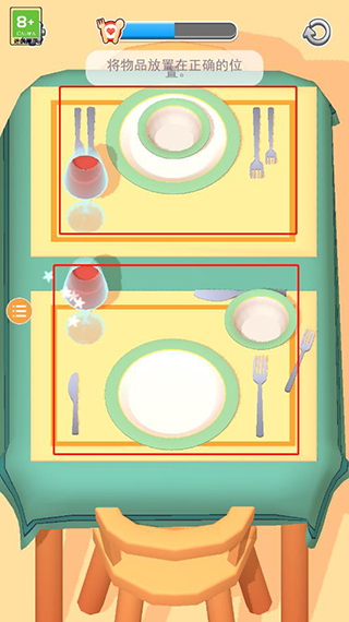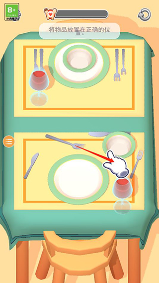 1、游戏玩法简单,按照关卡要求完成任务即可,比如进入游戏第一关就是将物品放置在正确的位置,点击移动餐具重新摆放;