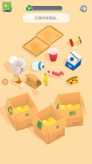 5、注意看关卡的要求,比如这里是正确回收物品,只要将物品正确放置收纳盒中即可通关;