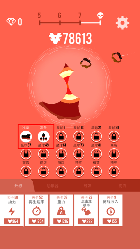 3、获取金币来升级动力、再生速率、重力等属性;