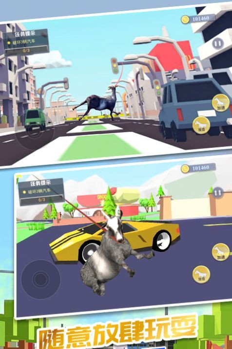 1、大家可以操作自己的山羊在城市随意行走,当你看到不爽的东西或者是人,都能将其顶翻;