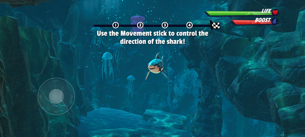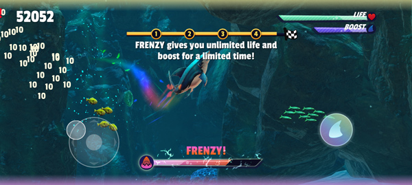 而在玩法上,饥饿鲨史前世界游戏依旧采用了经典的横版操纵,屏幕左边控制移动,右边则为加速键,玩家操纵鲨鱼吞噬小鱼,当下方能量条满后还可获取加速度,获取更多分数;