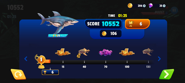 7、另外,游戏结束后得分越高,获取的金币和经验也就越多,金币可用来升级或解锁新鲨鱼。