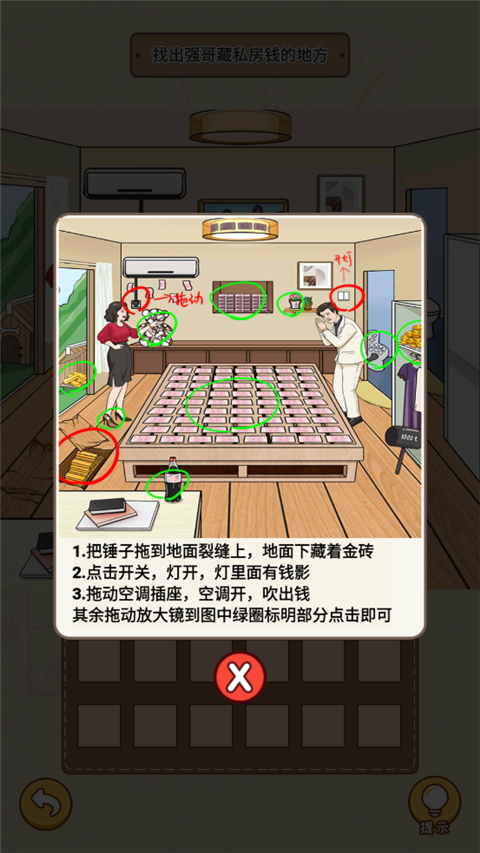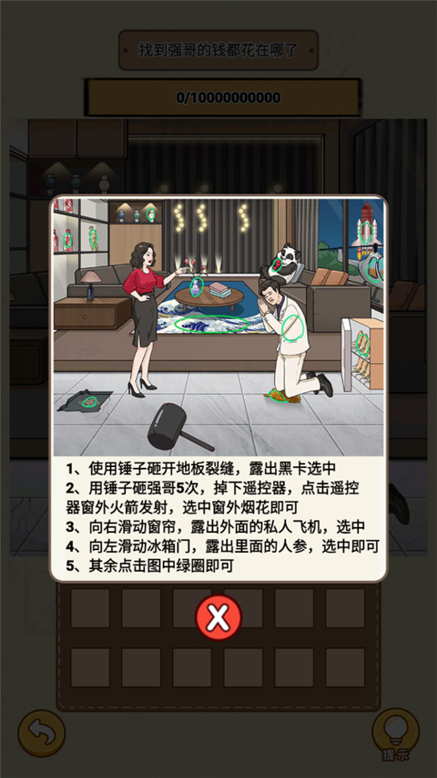 当然,一代沙雕游戏中很多东西也不能只看表面,也有很多隐藏的区域,比如用放大镜找、用锤子砸地板、滑动窗帘/门等等隐藏的小机关,玩家需要仔细观察哦。