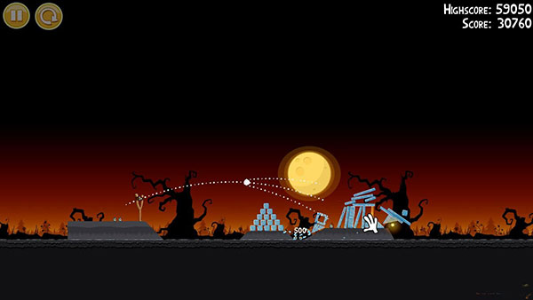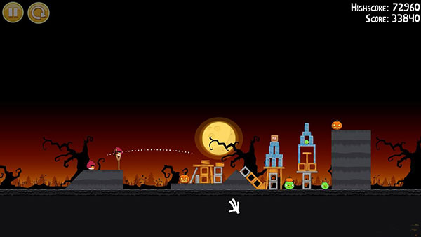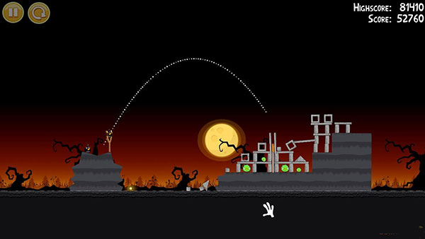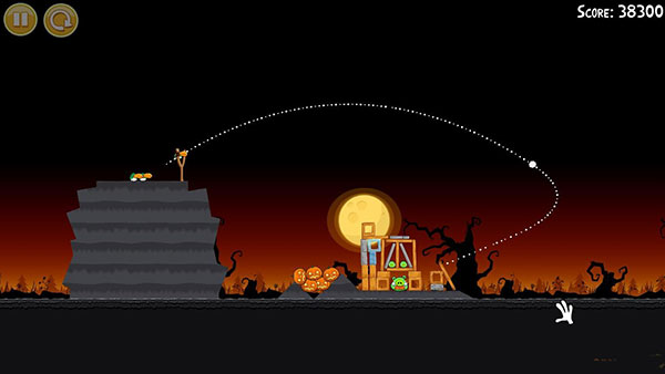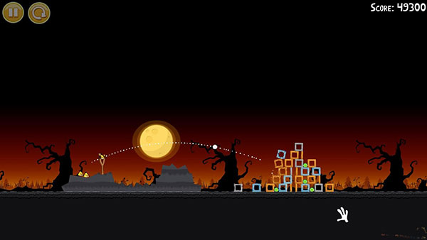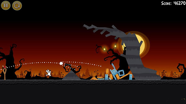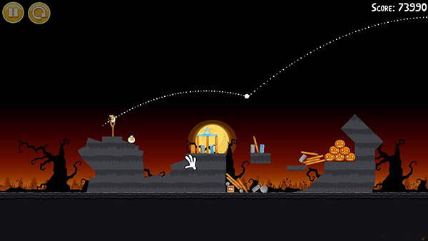 1-13:第一个回旋鸟按图中轨迹击溃建筑整体(有一定几率一鸟全灭),第二只鸟的位置跟第一只鸟差不多,只要击中位置网上一点即可,要确保左边的石砖倒向南瓜堆,一定要砸南瓜堆,否则无法三星!