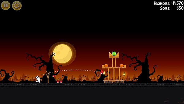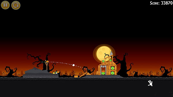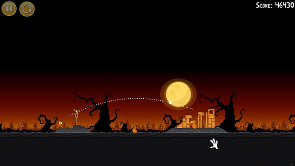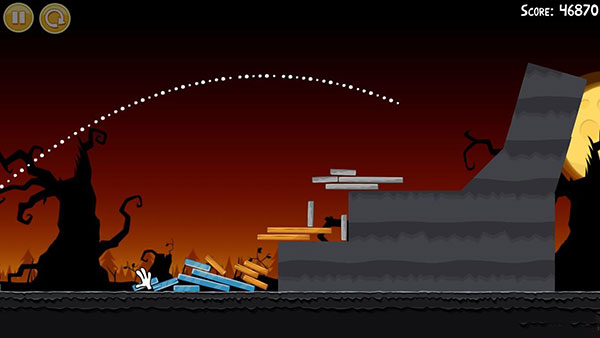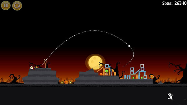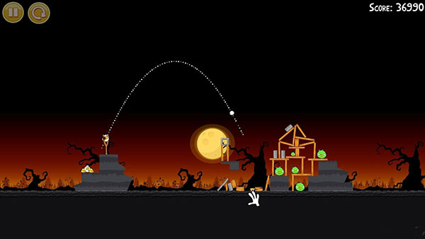 1-6:第一只鸟朝图中轨迹位置,击中左下角,干掉一个南瓜头,第二只鸟同样以一定角度斜插南瓜位置,(三星绝对拼人品,重复尝试了70多篇啊,苦逼有木有啊)